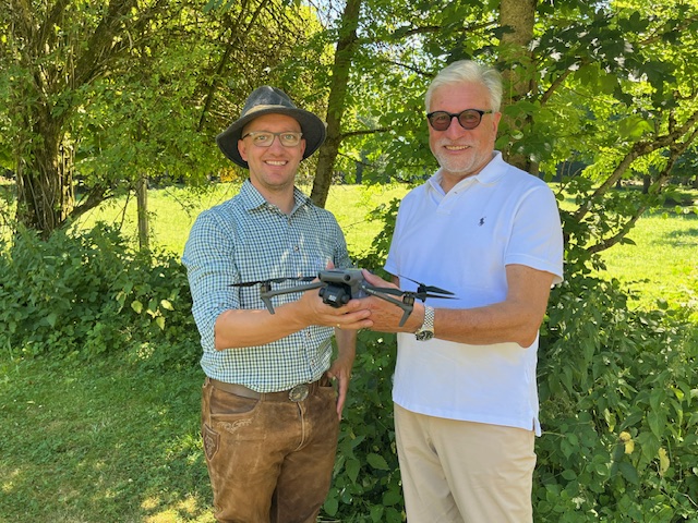 Im Rahmen des TAG DER JAGD im Wildgehege übergab der KJM Dr. Bernhard Kallup eine weitere vom Kreisverein angeschaffte Drohne an den Hegering Stühlingen. Hegeringleiter Philipp Kaiser nahm die Drohne in Empfang.