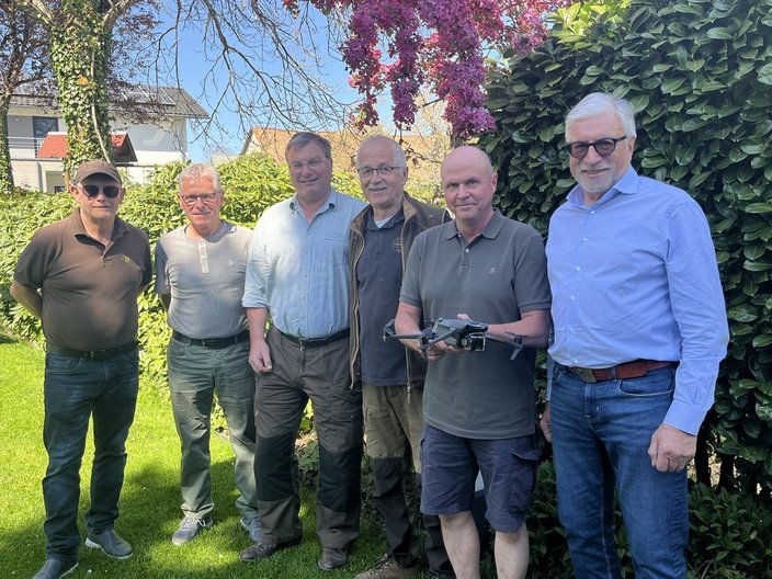 Am Samstag, dem 25.04.2026 konnte der Kreisjägermeister Dr. Bernhard Kallup die 11. Drohne zur Kitzrettung an den Hegering Waldshut übergeben. Oliver Wegmann (Hegeringleiter) nahm die Drohne in Empfang. Neben dem Drohnenobmann Andi Guse waren Klaus Obrist, Peter Knapp und Richard Probst als Drohnenpiloten vor Ort. Wir wünschen dem Drohnenteam des HR Waldshut viel Erfolg bei der Kitzrettung.