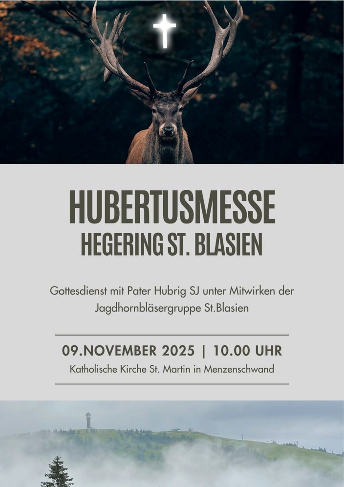 sehr gerne lade ich Euch heute zu unserer diesjährigen Hubertusmesse am 9.11. ab 10 Uhr in die katholische Kirche St. Martin in Menzenschwand ein.