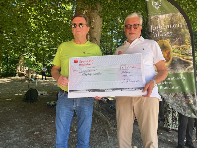 Der KJM konnte die 1. Beigeordnete Frau Petra Dorfmeister als Vertreterin der Bürgermeister begrüßen. Hubert Rossa wurde für seine unermüdliche Unterstützung ein Weinpräsent übergeben. Holger Knörzer ehrte Rheno van Kreuningen für 10 Jahre Mitgliedschaft bei den Tiengener Jagdhornbläser. Ganz besonders bedankte sich der KJM beim Wildgehegeverein, der es den Jägern ermöglichte, das Gelände für die Jubiläumsveranstaltung zu nutzen. Als Zeichen des Dankes und der langjährigen Verbundenheit überreichte der KJM einen Spendenscheck über 6000€ an den stellvertretenden Vorsitzenden Claus Schleith.