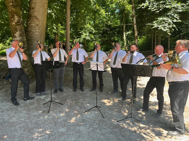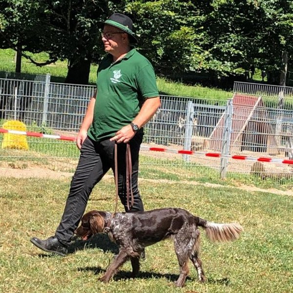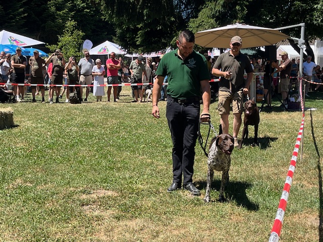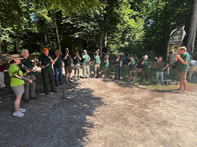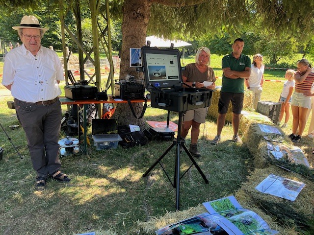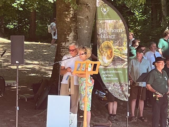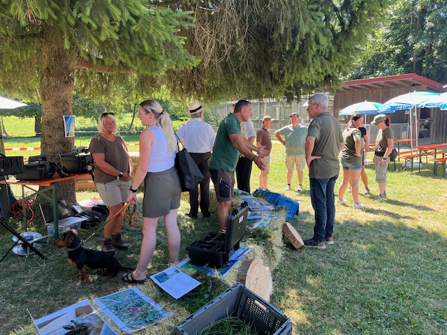 Die Aktionen der Obleute wurden vom Publikum sehr gut angenommen. Großes Interesse bestand an der Drohnenvorführung durch Melli Schrieder und Erik Gantert, die anhand von vielen Bildern über die Rettung der Rehkitze berichteten und die Arbeit an der Drohne vorführten. In diesem Zusammenhang wurde die bereits achte vom Kreisverein angeschaffte Drohne an Philipp Kaiser, Hegeringleiter des Hegerings Stühlingen, übergeben. Viele interessierte Hundefreunde verfolgten gespannt die Präsentationen der Jagdhunde, die Sabine Klös-Garand und unser Hundeobmann Claudius Rautenberg perfekt vorbereitet hatten. Vom Teckel über Vorstehhunde aller Art bis zu den Apportierhunden, Stöberhunden, Bracken und Terrier war alles mehrfach vertreten. Zahlreiche Interessenten besuchten auch den Stand der Jagdschule, wo Frank Decker und Ulrike Obrist Rede und Antwort gaben. Der LernortNaturwagen mit Sabine Decker und Markus Spiess hatten mehr Kinder erwartet, aber angesichts der großen Hitze war der Besuch im Schwimmbad doch wohl vorzuziehen. Last but not least… die Jagdhornbläser. Schon die Eröffnung der Veranstaltung war beeindruckend. Unter der Leitung des Bläserobmanns Holger Knörzer eröffneten die Jagdhornbläser in großer Formation die Veranstaltung. Es ist immer wieder ein Erlebnis, den Jagdhornbläsern in freier Natur zuzuhören. Die einzelnen Gruppen unterhielten die Gäste mit kurzen Platzkonzerten während der ganzen Veranstaltung.