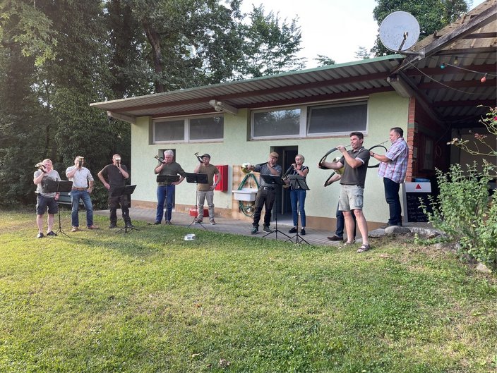 Im ehemaligen Schwimmbad in Herdern trafen sich die Mitglieder des HR Klettgau zum diesjährigen Grillfest. HR-Leiter Thomas Bommer freute sich, dass der Einladung zahlreiche Jägerinnen und Jäger samt Anhang gefolgt waren. Die Jagdhornbläser Hochrhein unterhielten mit jagdlicher Musik. Es war ein rundum gelungenes Fest an einem schönen Sommerabend mit guten Gesprächen und einem Grillbuffet, das keine Wünsche offen ließ.
