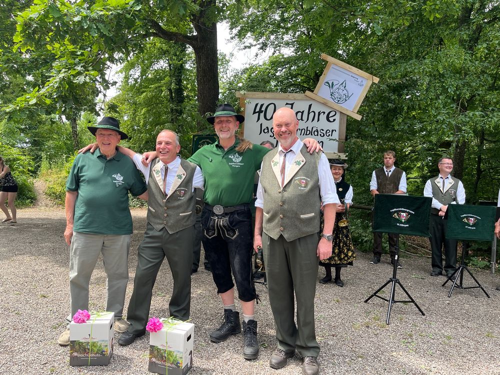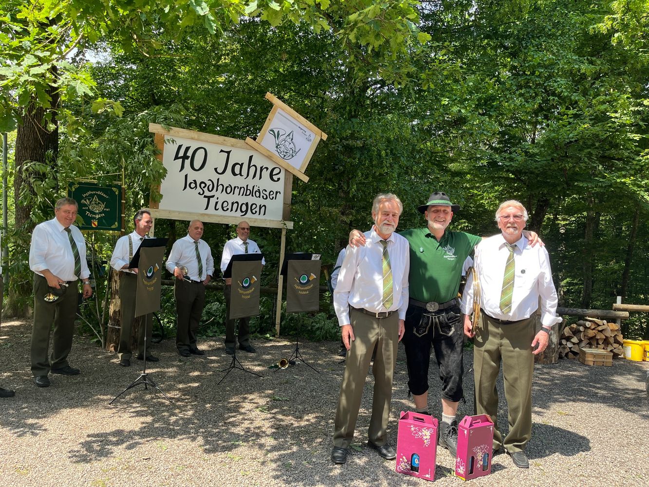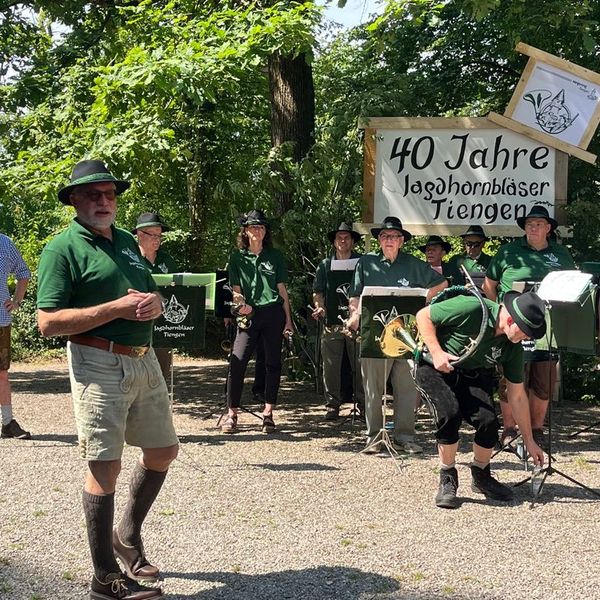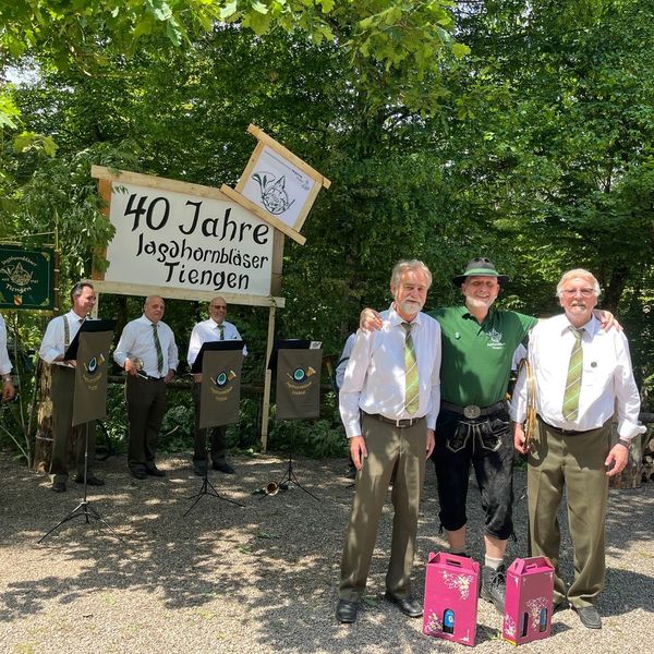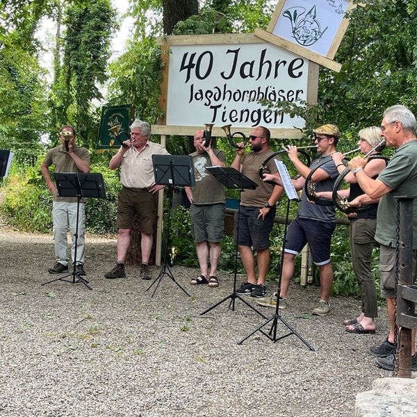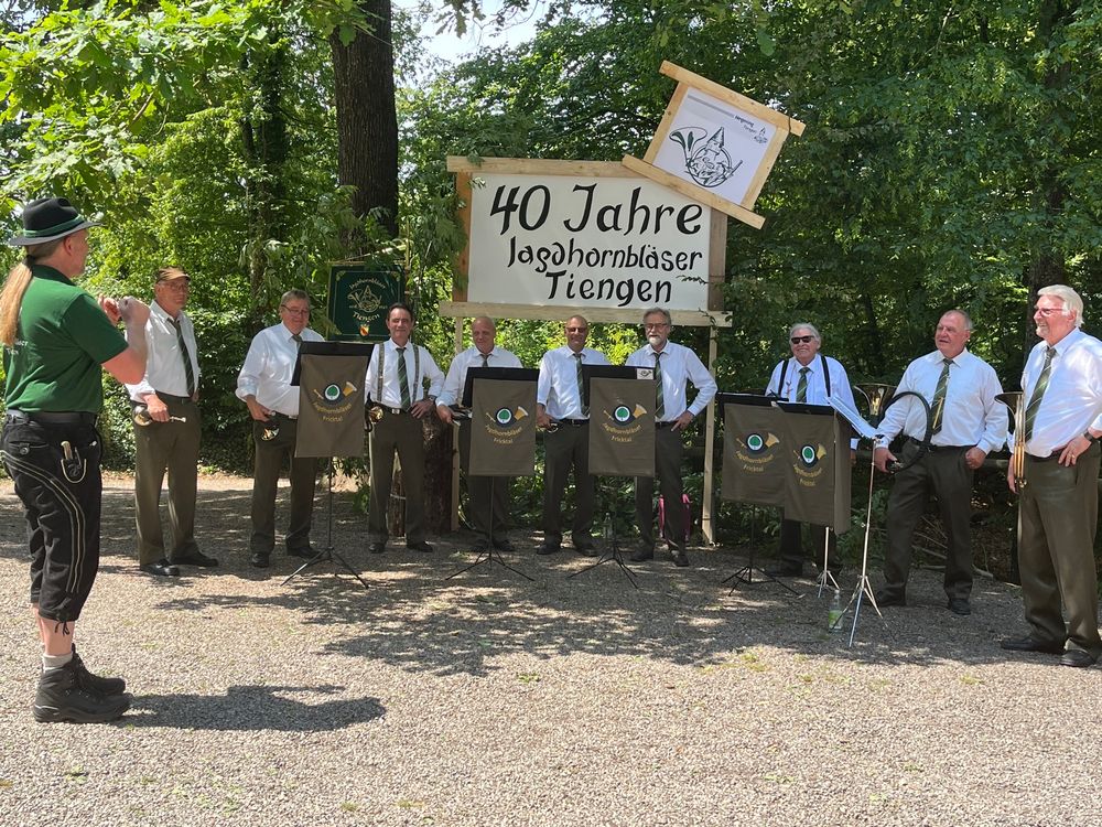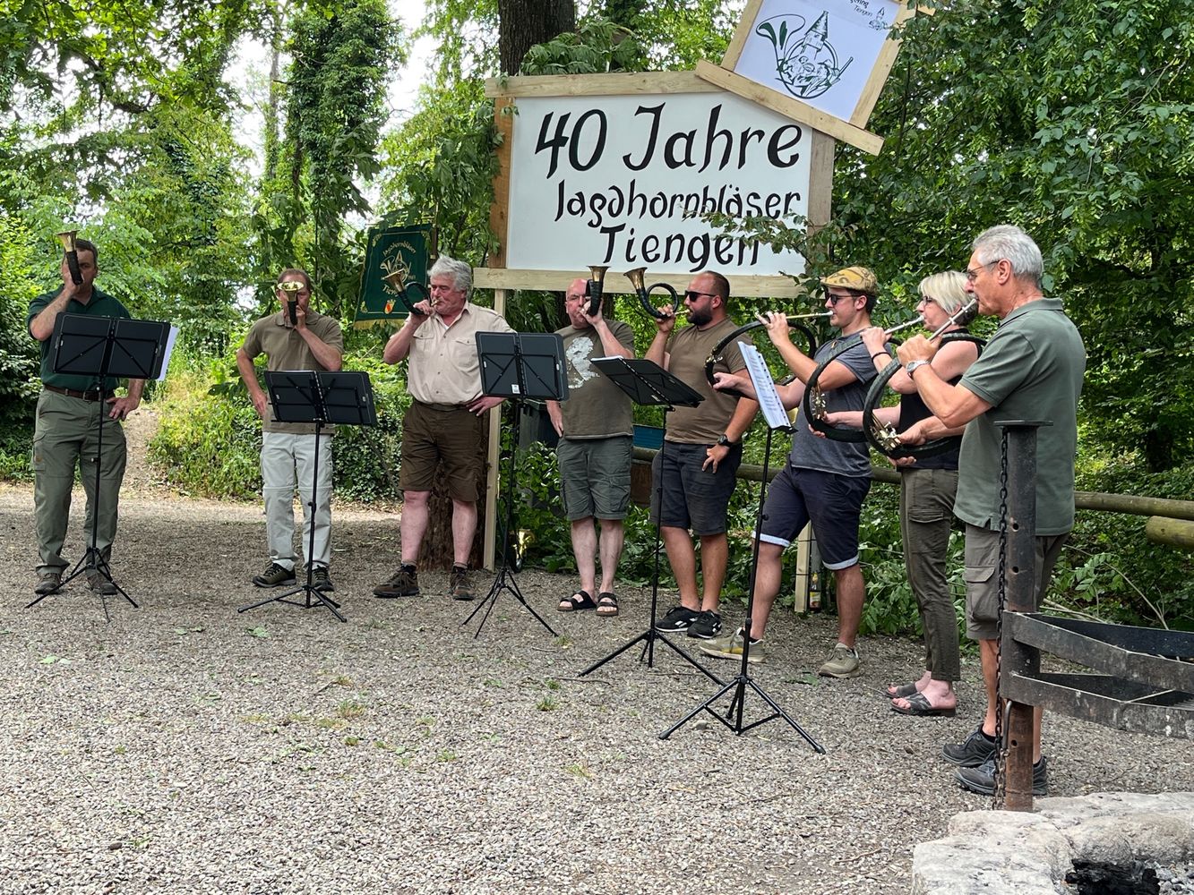 Bei strahlendem Sommerwetter feierte der Hegering Tiengen ein lockeres Familienfest und 40 Jahre Tiengener Jagdhornbläser auf der Wiggenberger Hütte in Lauchringen. Eine große Anzahl von HR Mitgliedern war der Einladung gefolgt und groß und klein genoß das lockere Zusammensein mit den zahlreichen Bläsern, die auf dem 40jährigen Jubiläeum der Tiengener Jagdhornbläser Geburtstagsständchen darbrachten. Aus dem Kreisverein waren die St. Blasier und Klettgauer Bläser Holger Knörzers Einladung gefolgt. Aber auch die befreundeten Bläsergruppen aus Fricktal und St. Märgen ließen es sich nicht nehmen, nach Lauchringen zu kommen. Jede Gruppe brachte auf der ihr eigenen Art jagdliche Musik dar, was den Zuhörern große Freude bereitete. Für die 40 Jahre JHB Tiengen brachte der Kreisjägermeister 4 Kisten Wein mit, die für die Weihnachtsfeier reserviert werden sollen. Auch der HR Leiter Uli Schäfer dankte den Bläsern für ihren Einsatz, wenn es darum ging, Veranstaltungen musikalisch zu untermalen und so die Jägerschaft in der Öffentlichkeit zu repräsentieren. Neben den beiden Gründungsmitgliedern Bruno Bastianelli und Gerd Frings wurden Markus Spiess für 10 Jahre und Steffen Guhl für 20 Jahre Mitgliedschaft bei den JHB Tiengen geehrt. Krönender Abschluß war das gemeinsame Musizieren aller Bläsergruppen in einem Gesamtchor. Allen, die zum Gelingen dieser gelungenen und harmonischen Veranstaltung beigetragen haben, ein herzliches Dankeschön. Den JHB Tiengen weiterhin viel Freude beim gemeinsamen Jagdhornblasen.