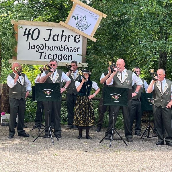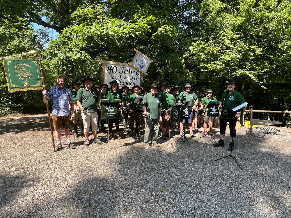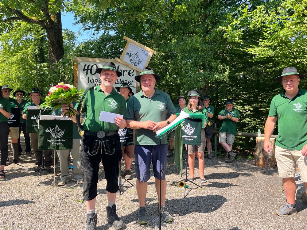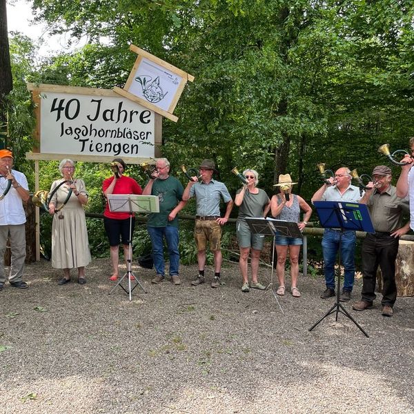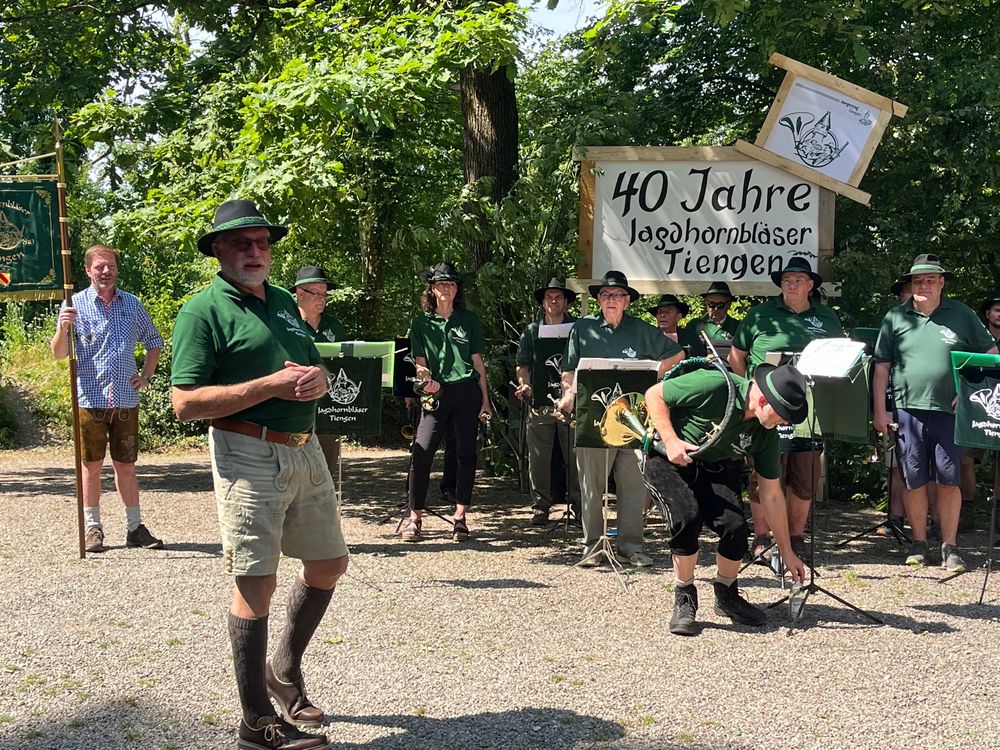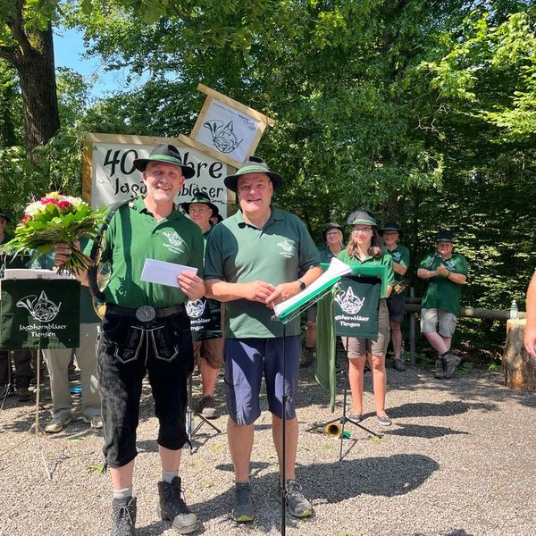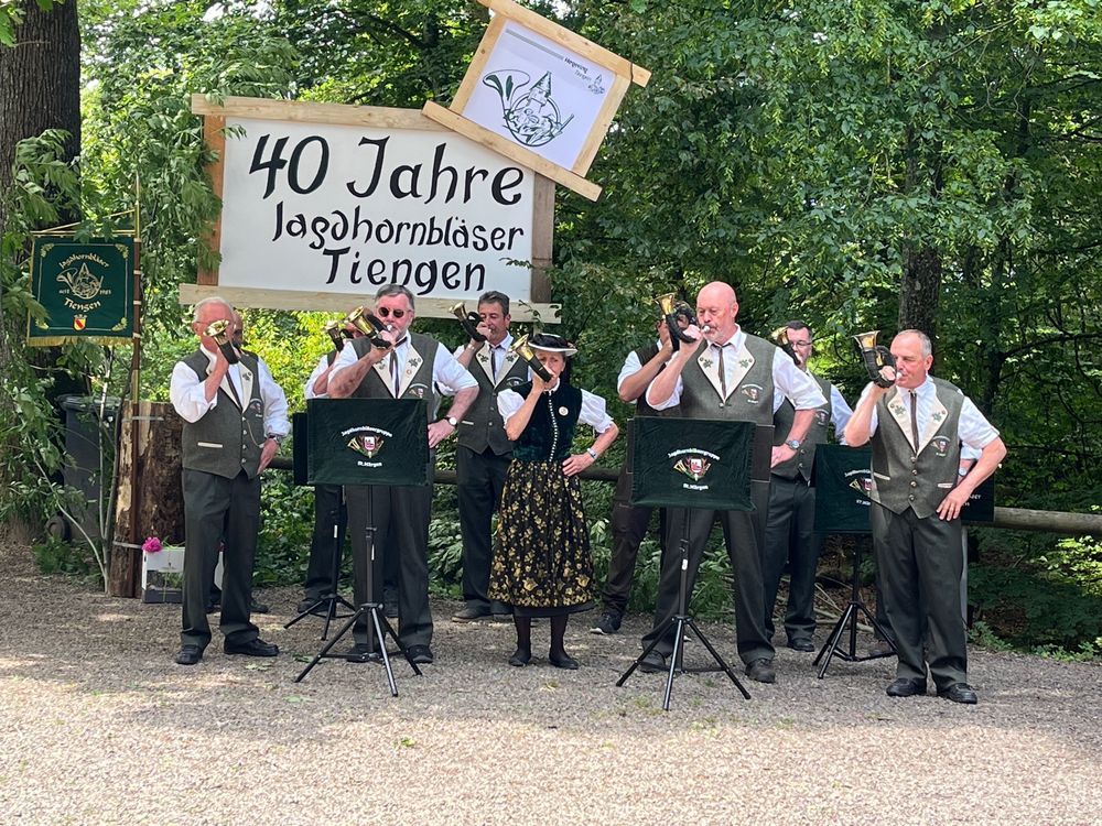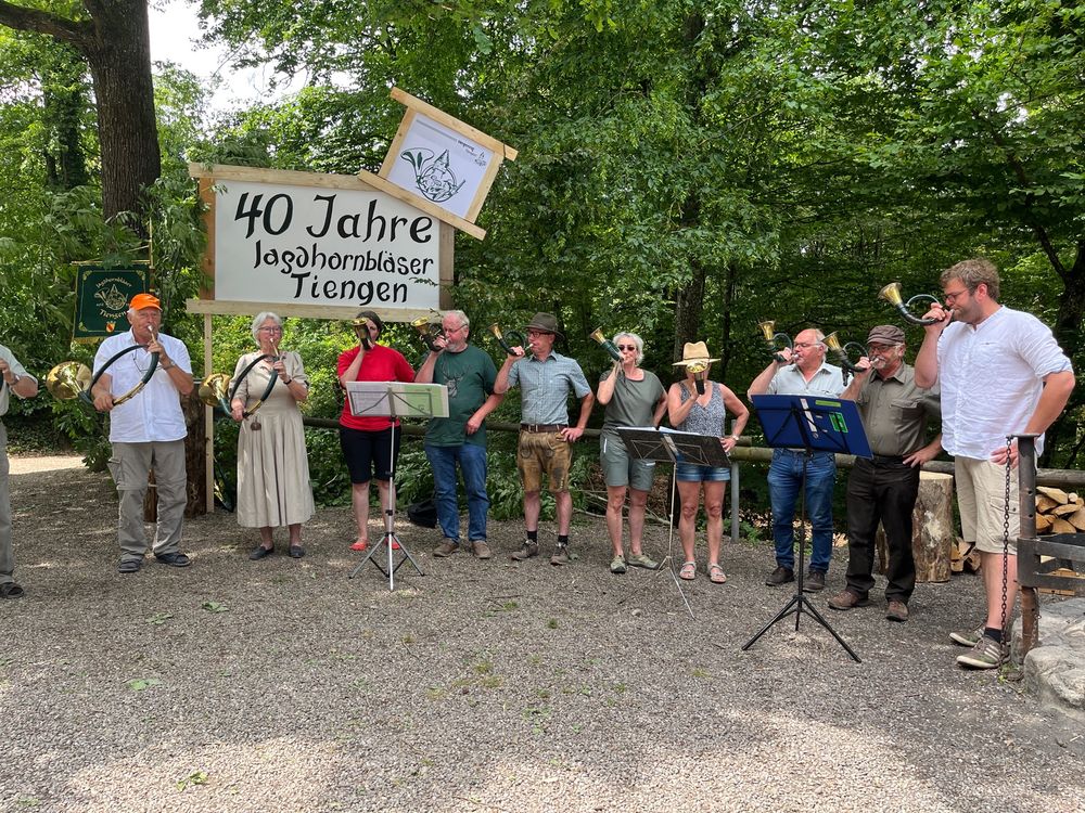 Bei strahlendem Sommerwetter feierte der Hegering Tiengen ein lockeres Familienfest und 40 Jahre Tiengener Jagdhornbläser auf der Wiggenberger Hütte in Lauchringen. Eine große Anzahl von HR Mitgliedern war der Einladung gefolgt und groß und klein genoß das lockere Zusammensein mit den zahlreichen Bläsern, die auf dem 40jährigen Jubiläeum der Tiengener Jagdhornbläser Geburtstagsständchen darbrachten. Aus dem Kreisverein waren die St. Blasier und Klettgauer Bläser Holger Knörzers Einladung gefolgt. Aber auch die befreundeten Bläsergruppen aus Fricktal und St. Märgen ließen es sich nicht nehmen, nach Lauchringen zu kommen. Jede Gruppe brachte auf der ihr eigenen Art jagdliche Musik dar, was den Zuhörern große Freude bereitete. Für die 40 Jahre JHB Tiengen brachte der Kreisjägermeister 4 Kisten Wein mit, die für die Weihnachtsfeier reserviert werden sollen. Auch der HR Leiter Uli Schäfer dankte den Bläsern für ihren Einsatz, wenn es darum ging, Veranstaltungen musikalisch zu untermalen und so die Jägerschaft in der Öffentlichkeit zu repräsentieren. Neben den beiden Gründungsmitgliedern Bruno Bastianelli und Gerd Frings wurden Markus Spiess für 10 Jahre und Steffen Guhl für 20 Jahre Mitgliedschaft bei den JHB Tiengen geehrt. Krönender Abschluß war das gemeinsame Musizieren aller Bläsergruppen in einem Gesamtchor. Allen, die zum Gelingen dieser gelungenen und harmonischen Veranstaltung beigetragen haben, ein herzliches Dankeschön. Den JHB Tiengen weiterhin viel Freude beim gemeinsamen Jagdhornblasen.