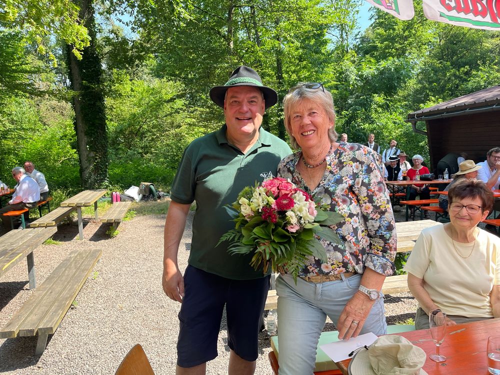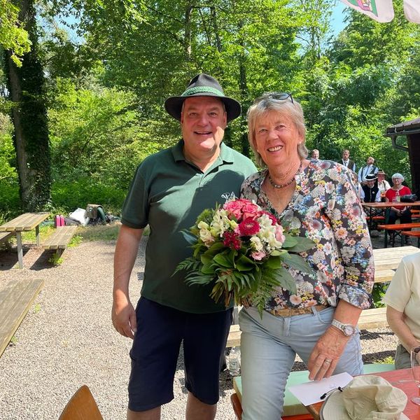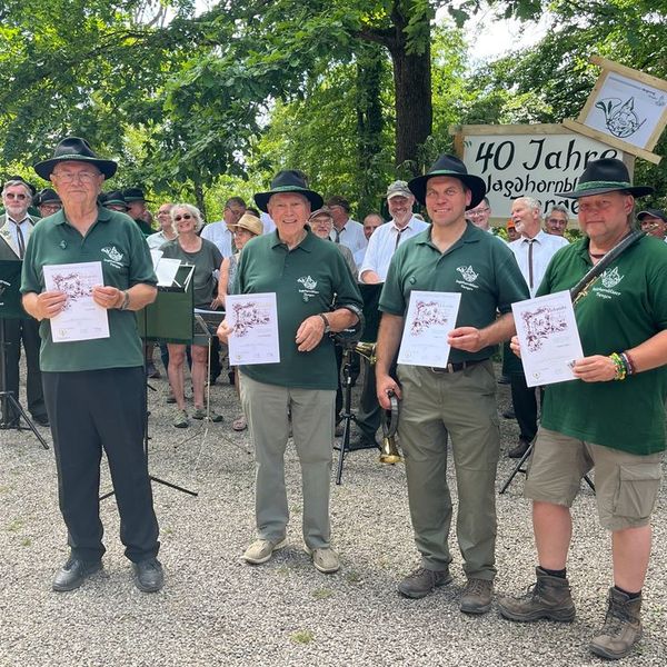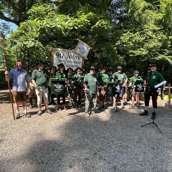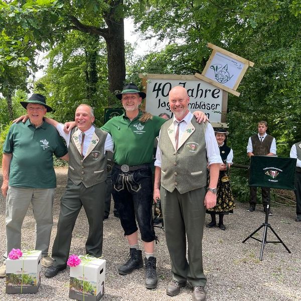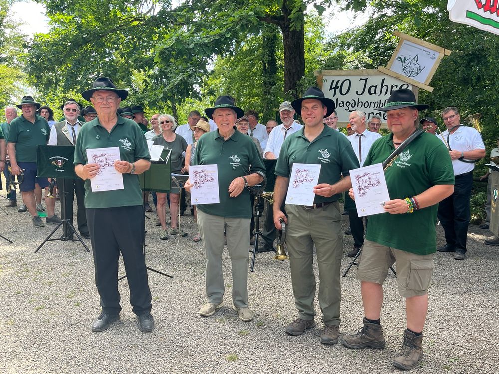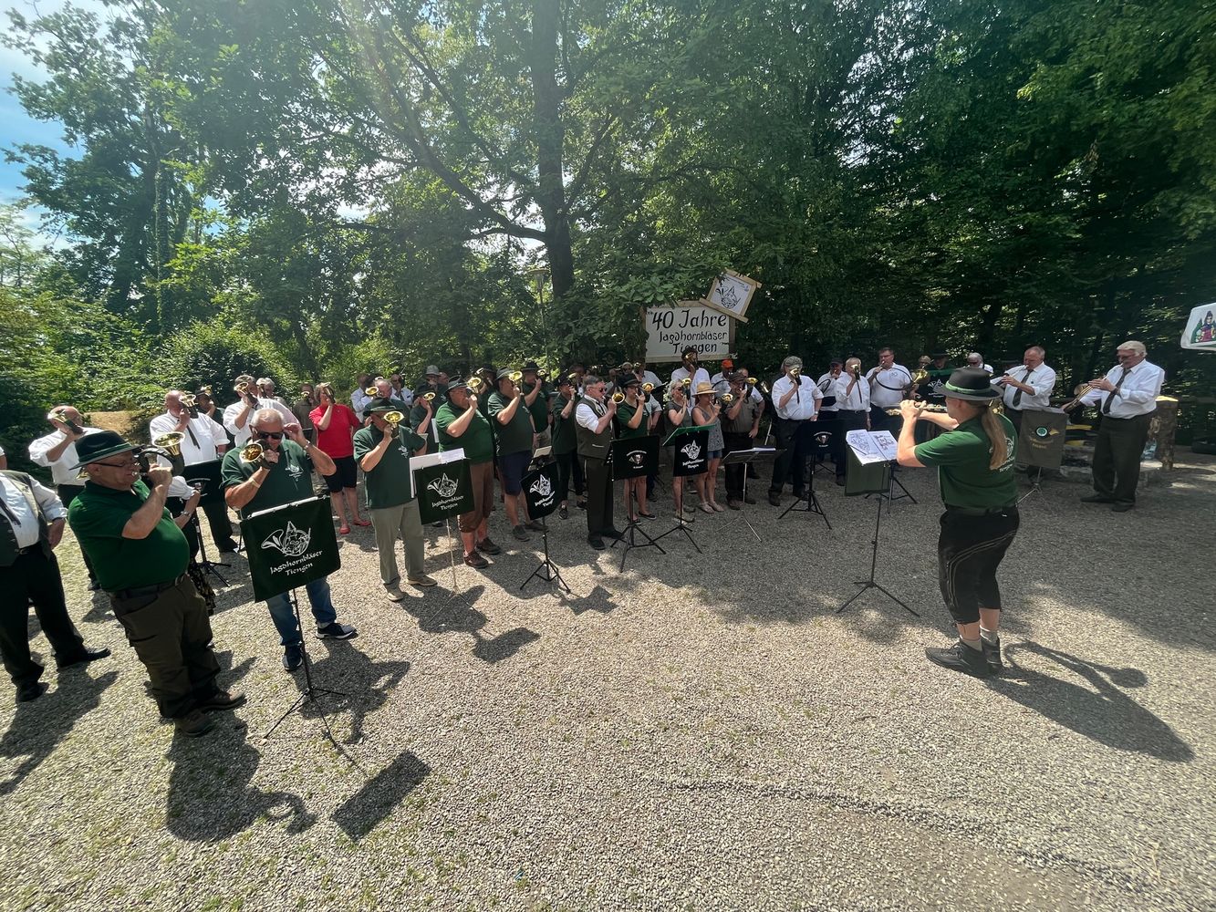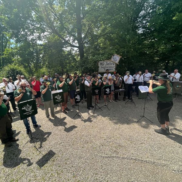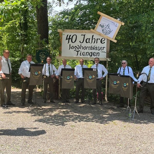 Bei strahlendem Sommerwetter feierte der Hegering Tiengen ein lockeres Familienfest und 40 Jahre Tiengener Jagdhornbläser auf der Wiggenberger Hütte in Lauchringen. Eine große Anzahl von HR Mitgliedern war der Einladung gefolgt und groß und klein genoß das lockere Zusammensein mit den zahlreichen Bläsern, die auf dem 40jährigen Jubiläeum der Tiengener Jagdhornbläser Geburtstagsständchen darbrachten. Aus dem Kreisverein waren die St. Blasier und Klettgauer Bläser Holger Knörzers Einladung gefolgt. Aber auch die befreundeten Bläsergruppen aus Fricktal und St. Märgen ließen es sich nicht nehmen, nach Lauchringen zu kommen. Jede Gruppe brachte auf der ihr eigenen Art jagdliche Musik dar, was den Zuhörern große Freude bereitete. Für die 40 Jahre JHB Tiengen brachte der Kreisjägermeister 4 Kisten Wein mit, die für die Weihnachtsfeier reserviert werden sollen. Auch der HR Leiter Uli Schäfer dankte den Bläsern für ihren Einsatz, wenn es darum ging, Veranstaltungen musikalisch zu untermalen und so die Jägerschaft in der Öffentlichkeit zu repräsentieren. Neben den beiden Gründungsmitgliedern Bruno Bastianelli und Gerd Frings wurden Markus Spiess für 10 Jahre und Steffen Guhl für 20 Jahre Mitgliedschaft bei den JHB Tiengen geehrt. Krönender Abschluß war das gemeinsame Musizieren aller Bläsergruppen in einem Gesamtchor. Allen, die zum Gelingen dieser gelungenen und harmonischen Veranstaltung beigetragen haben, ein herzliches Dankeschön. Den JHB Tiengen weiterhin viel Freude beim gemeinsamen Jagdhornblasen.