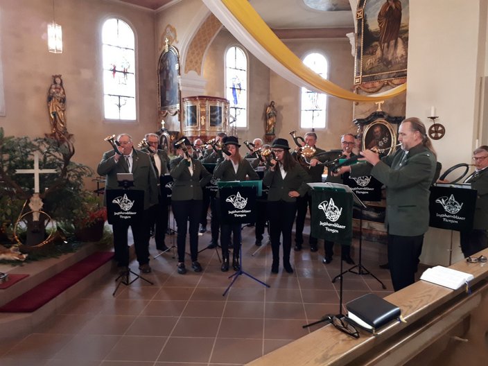 Am Sonntag, dem 06.11.2022 umrahmten die Tiengener Jagdhornbläser die Sonntagsmesse in der von den Bläsern jagdlich geschmückten St. Ursula Kirche in Ühlingen. Unter der Leitung des Bläserobmanns Holger Knörzer führten die JHB anspruchsvolle Musikstücke der Kompanisten H. Neuhaus und Z. Fiala auf. Die zahlreichen Besucher der Messe dankten den JHB mit langem Applaus.