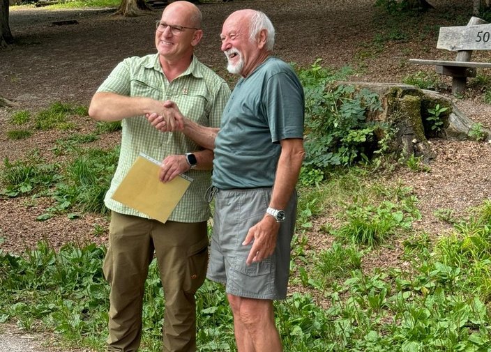 Bei bestem Wetter konnte der HR Waldshut am 27.07.2024 rund 40 Mitglieder zum diesjährigen Grillfest im Waldshuter Wildgehege begrüßen. Hegeringleiter Markus Hölzer ehrte Dr. Detlef Brensing für seine 25jährige Mitgliedschaft im Kreisverein und übergab die Anstecknadel sowie die Urkunde. In geselliger Runde verbrachten die Jäger mit Anhang eine unterhaltsame Zeit. Die Jagdhornbläser Waldshut umrahmten die Veranstaltung. Den Kuchenspendern und Ralf Matt, der die Gäste mit Gegrilltem verwöhnte, ein herzliches Dankeschön.