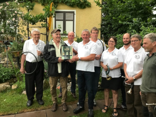 Die Bläsergruppe Waldshut unter der musikalischen Leitung von Klaus Obrist freute sich über die Einladung und ließ den Jubilar Karl Maichel am Abend hoch leben. Gleichzeitig überreichte Michael Ebi vom Hegering Waldshut und Kreisverein ein Präsent.