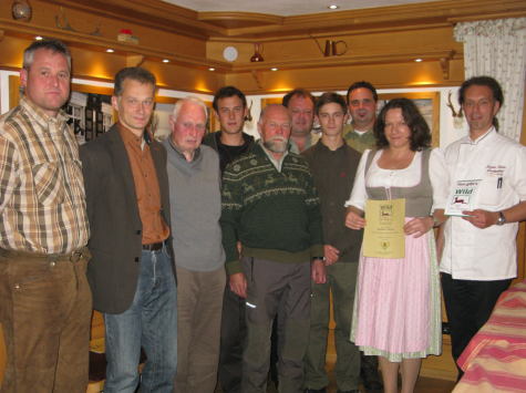 Stellvertretender Hegeringleiter Uwe Maier aus St. Blasien überreichte im Beisein der Jäger Stefan Mayer aus St. Blasien, Harald Kreuz / Wolfgang Steiert / Rudolph Schmidt / Benedikt und Christopher Neumann aus Bernau sowie Thomas Berger aus Menzenschwand die Urkunde Wild aus der Region an Wirtehepaar Brigitte und Jürgen Schön von den Landgasthof Bergblick in Bernau.