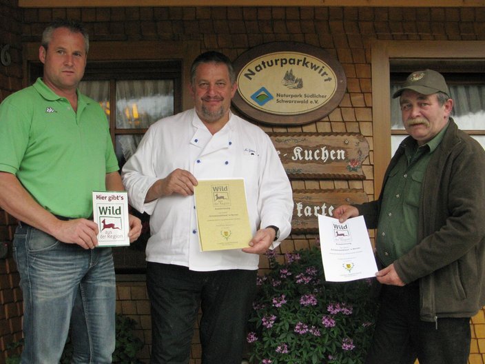 Diese Auszeichnung bekam nun auch der Gasthof "Schwarzwaldhof" in Bernau-Innerlehen. Damit werden Gastronomiebetriebe ausgezeichnet, die sich verpflichten, mindestens 90 Prozent des angebotenen Wildes aus Jagdrevieren der Region, im Umkreis von 100 km, zu beziehen. Norbert Goos, Inhaber des Gasthofes, bezieht das Rotwild, Schwarzwild und Rehwild, mitunter auch Gamsen, vorwiegend aus den Revieren in Bernau, Menzenschwand, Todtmoos und Höchenschwand. Mit dieser Auszeichnung unterstützt Naturparkwirt Norbert Goos die regionale Erzeugung gesunder Lebensmittel aus nachhaltiger Jagd mit dem Hinweis, dass kaum ein Lebensmittel aus der Natur so gesund und schmackhaft sei wie das heimische Wildbret.