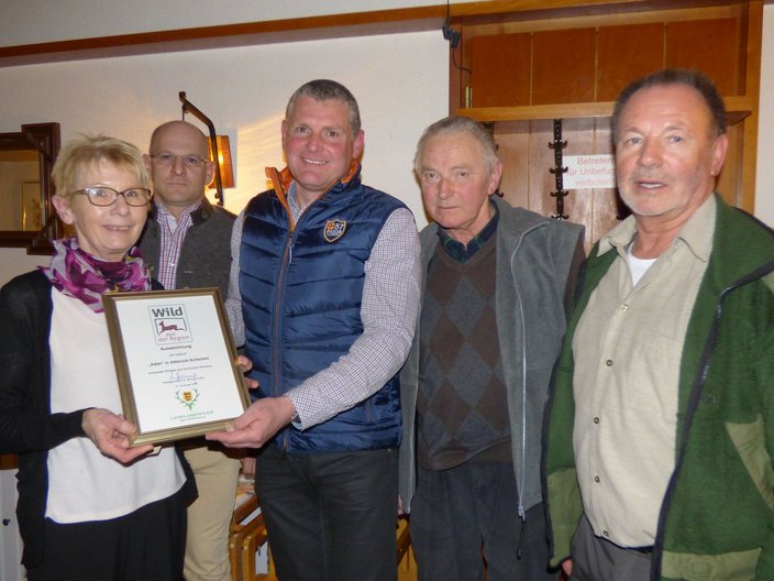 Mit der Auszeichnung: „Wild aus der Region“ hat der Landesjagdverband ein Gütesiegel entwickelt, das für die Verbraucher ein Garant für kurze Wege und nachhaltige Wildvermarktung darstellt. Mit der Übergabe dieser Auszeichnung durch Hegeringleiter Michael Ebi an Gertrud Knab verpflichtete sich die Schachener Adler-Wirtin per Unterschrift, dass das von ihr verarbeitete und auf den Tellern der Gäste gelangende Reh- und Schwarzwild aus dem Umland kommt. Bei der Verleihung mit dabei waren der stellvertretende Hegeringleiter Markus Hölzer (2. von links) und die Jagdkollegen Wolfgang Hein und Bernhard Matt (von rechts).